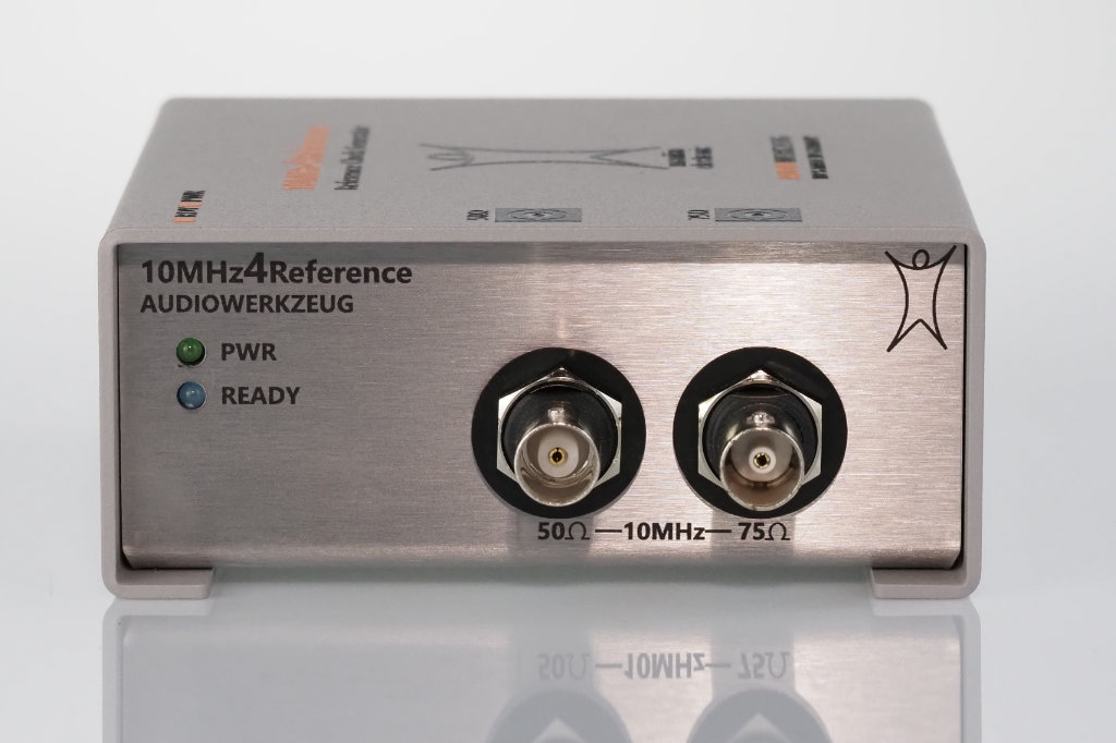 Mit der 10MHz4Reference liegt eine hochpräzise Master Clock vor, die es ermöglicht, die vollständige Signalkette mit einem zentralen Takt zu versorgen. Ein Ofen-gesteuerter Oszillator (OCXO) gewährleistet eine hohe Taktgenauigkeit, niedriges Phasenrauschen und Langzeitstabilität. Eine galvanische Trennung der Taktausgänge verhindert zudem niederfrequente „Schwebungen“ des Taktsignals durch Masseschleifen. Mit jeweils einem 50Ohm und einem 75Ohm Ausgang kann die 10MHz4Reference mit jedem Audiogerät verwendet werden, das über einen entsprechenden Referenzeingang verfügt.